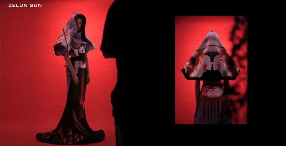 为了唤起动感,Rin Choe的作品探索了2D图案裁剪的替代方法,使用捕获的运动图像作为服装上的固定细节。“我试图通过图案切割将捕捉的瞬间融入设计细节中,以实现捕捉瞬间的能量。”